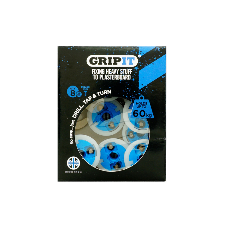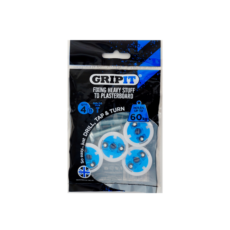 Just one Gripit Blue holds up to 60KG. To install, you will require a 25mm drill bit.